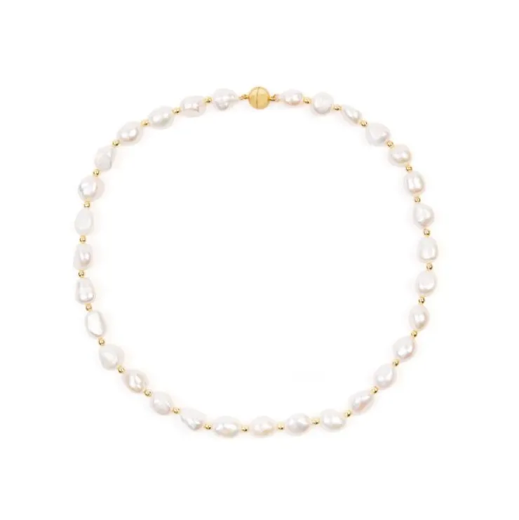 A Feminine And Elegant Necklace Of 10-11Mm Baroque Pearls Interspersed With Small Round Gold Plated Hematite Beads, On A Gold Plated Magnetic Ball Clasp.