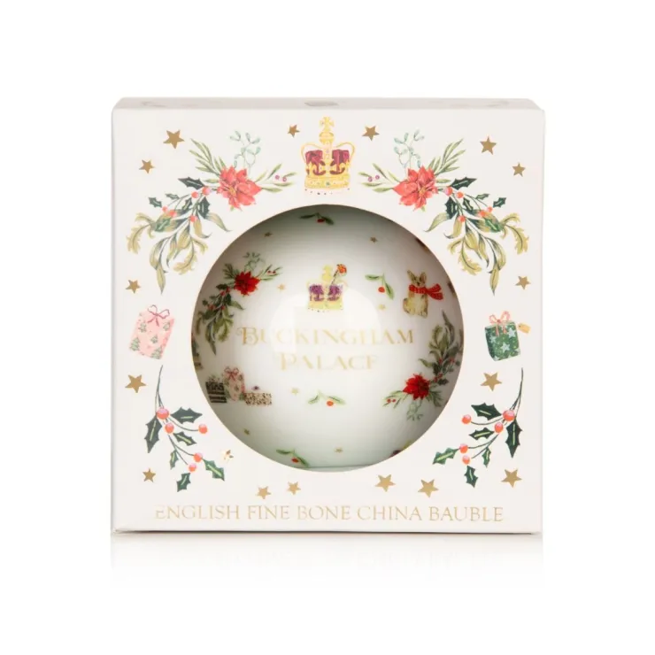English Fine Bone China Bauble Featuring A Festive Illustration Of Buckingham Palace And An Assortment Of Royal Imagery.